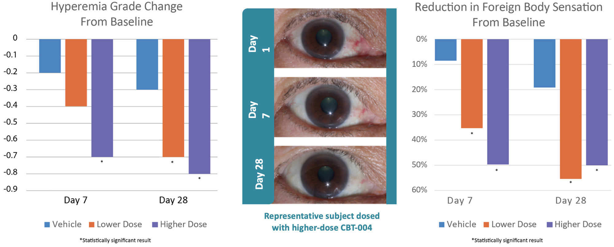 The time course data illustrates that CBT-004’s effects emerge rapidly and are sustained through the primary endpoint. The 0.075% high-dose arm demonstrated a statistically significant separation from vehicle as early as Day 7 (p = 0.007) — a clinical indicator of rapid onset of pharmacological activity. Both doses continued to show significant benefit at Day 28, the primary endpoint. This early and sustained efficacy profile supports CBT-004’s potential as the first meaningful pharmacological therapy for vascularized pinguecula.