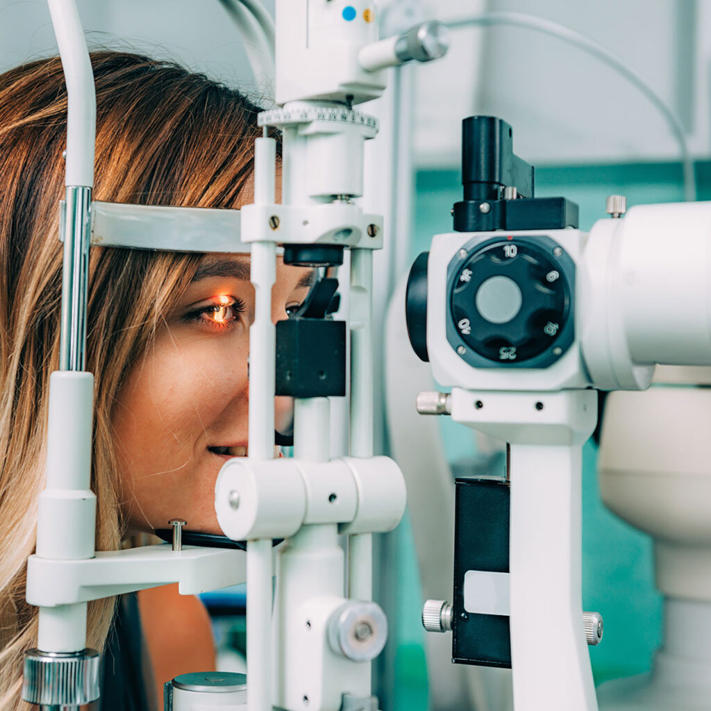 Examination by a professional eye doctor is required to diagnose pterygium. Using a slit lamp, the eye doctor closely inspects the wing‑shaped growth on the white of the eye and where it extends onto the cornea, which is how a pterygium is confirmed and documented.