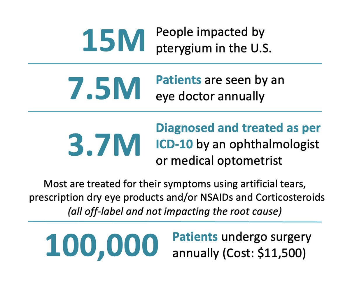 Pterygium is a common eye disease that impacts 15M people in the U.S., with no FDA-approved drug therapy.1,2